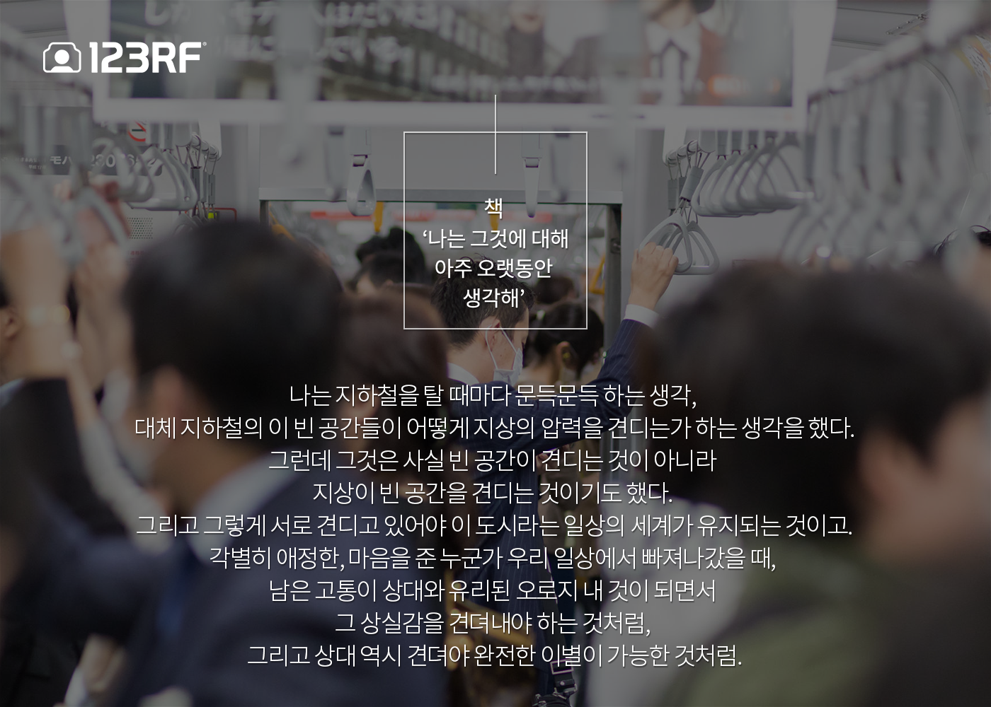 나는 지하철을 탈 때마다 문득문득 하는 생각, 대체 지하철의 이 빈 공간들이 어떻게 지상의 압력을 견디는가 하는 생각을 했다. 그런데 그것은 사실 빈 공간이 견디는 것이기도 했다. 그리고 그렇게 서로 견디고 있어야 이 도시라는 일상의 세계가 유지되는 것이고. 각별히 애정한, 마음을 준 누군가 우리 일상에서 빠져나갔을 때, 남은 고통이 상대와 유리된 오로지 내 것이 되면서 그 상실감을 견뎌내야 하는 것처럼, 그리고 상대 역시 견뎌야 완전한 이별이 가능한 것처럼.