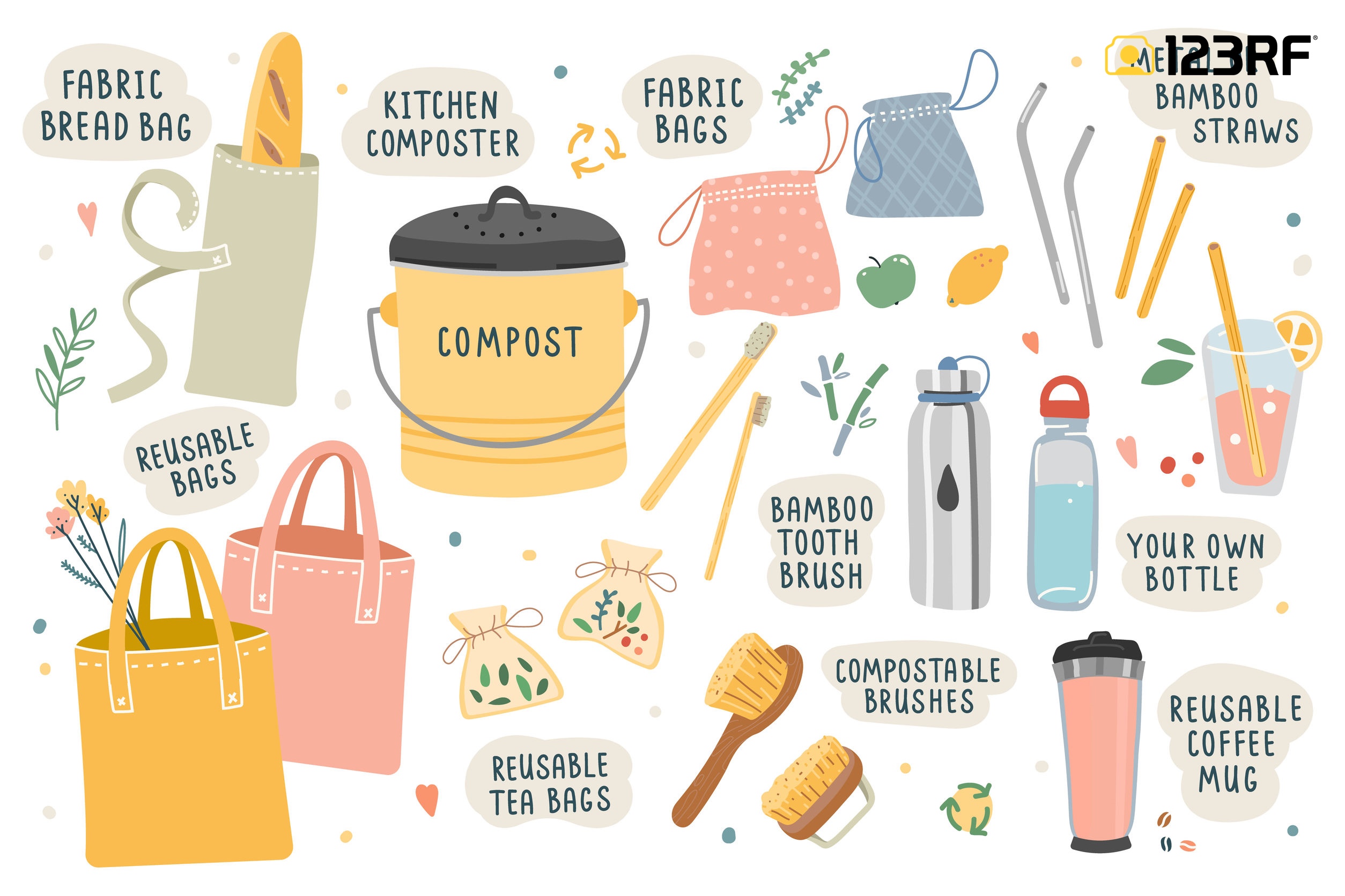 정해져 있는 방법은 없으나 우선 일상 속에서 사용하고 있는 일회용 제품부터 줄이기! 에디터도 이전까지는 회사에 출근을 하면 무조건 큰 종이컵에 커피를 타 마셨는데 지금은 텀블러를 애용하고 있답니다. 👍 실천하기 가장 쉬운 부분을 시작으로, '폼클렌징 대신 클렌징 비누', ' 플라스틱 칫솔 대신 대나무 칫솔', '주방 세제 대신 설거지 비누', '아크릴 수세미 대신 천연 수세미', '액체 세제 대신 시트 세제', '일회용 생리대 대신 생리 컵 면생리대', '가죽백 대신 에코백' 등 일회용품을 줄이기 위한 수많은 대체품을 활용하는 것이 중요! 그와 더불어 '제대로 분리 배출하기' 또한 제로 웨이스트 원칙을 지키는 행동이랍니다. 123RF와 제로 웨이스트를 향하여 함께 걸어가 보실까요? 😎