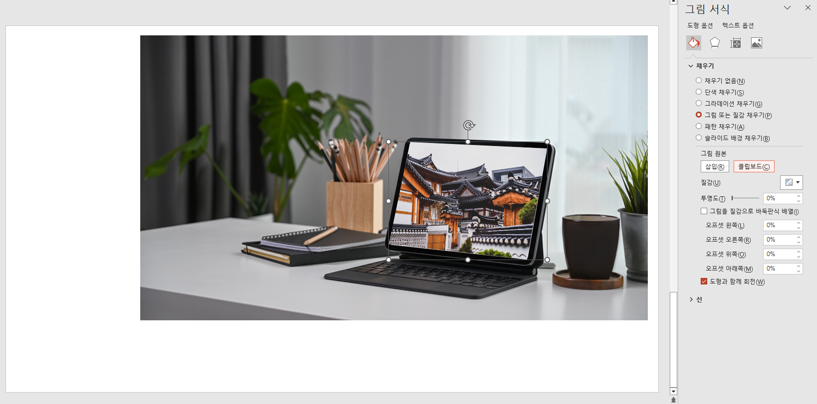 도형 재클릭 > 도형 서식 > 그림 또는 질감 채우기 > 클립보드 클릭하면 아래와 같이 들어가요. 완성!