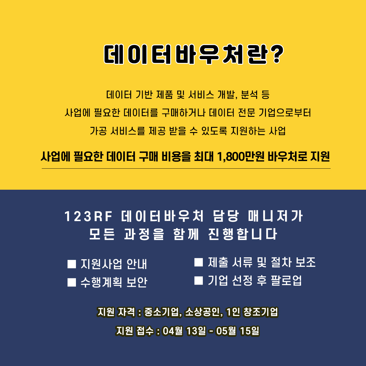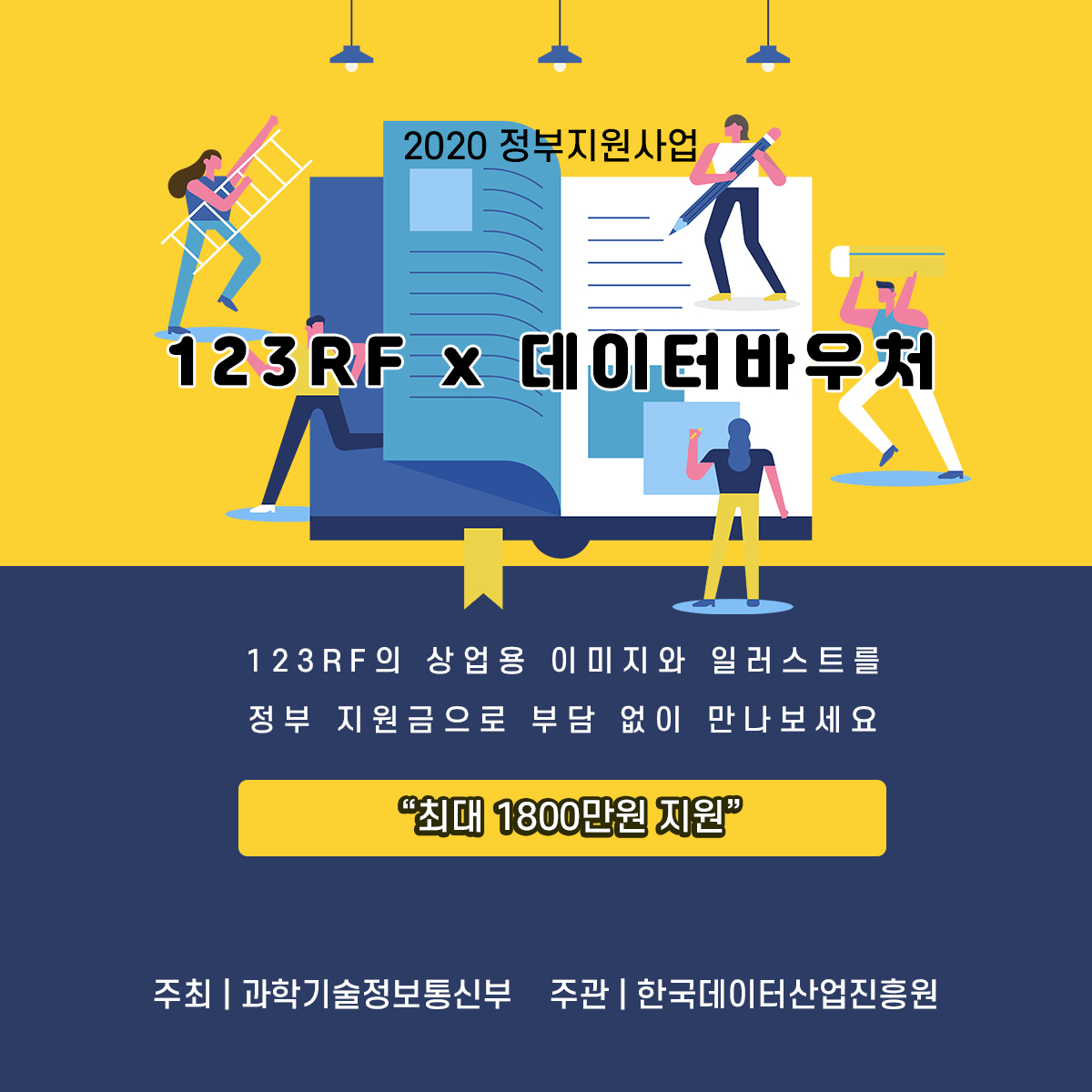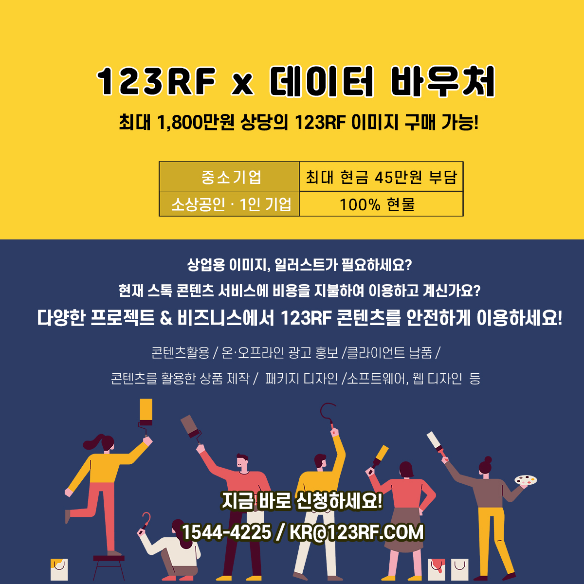 사업에 필요한 데이터 구매 비용을 최대 1,800만원 바우처로 지원 : 1,800만원 상당의 123RF 이미지 구매 가능!